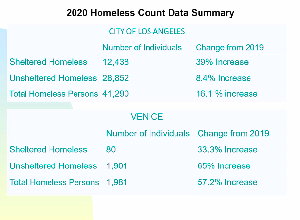 While Venice represents roughly 4.3 percent of CD-11’s land, it houses 60.5 percent of the district’s homeless population, according to LASHA‘s 2020 homeless count.