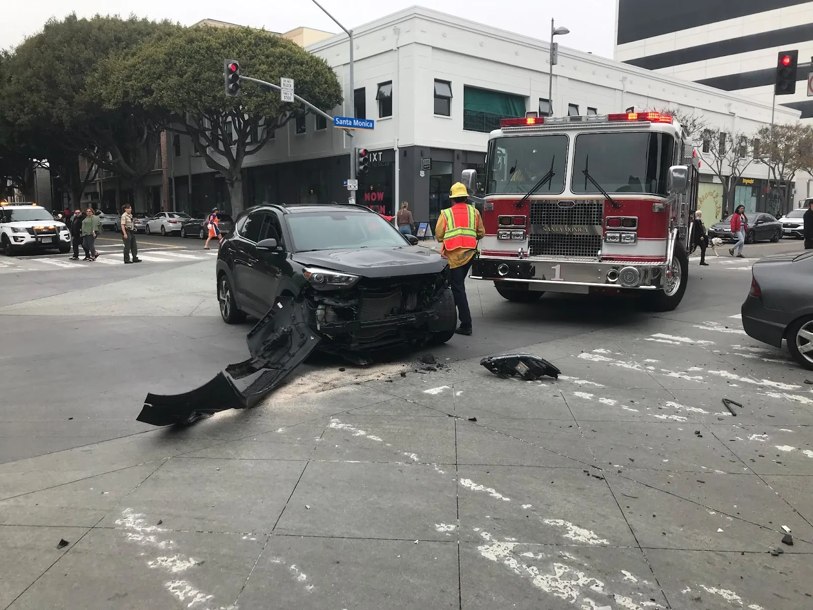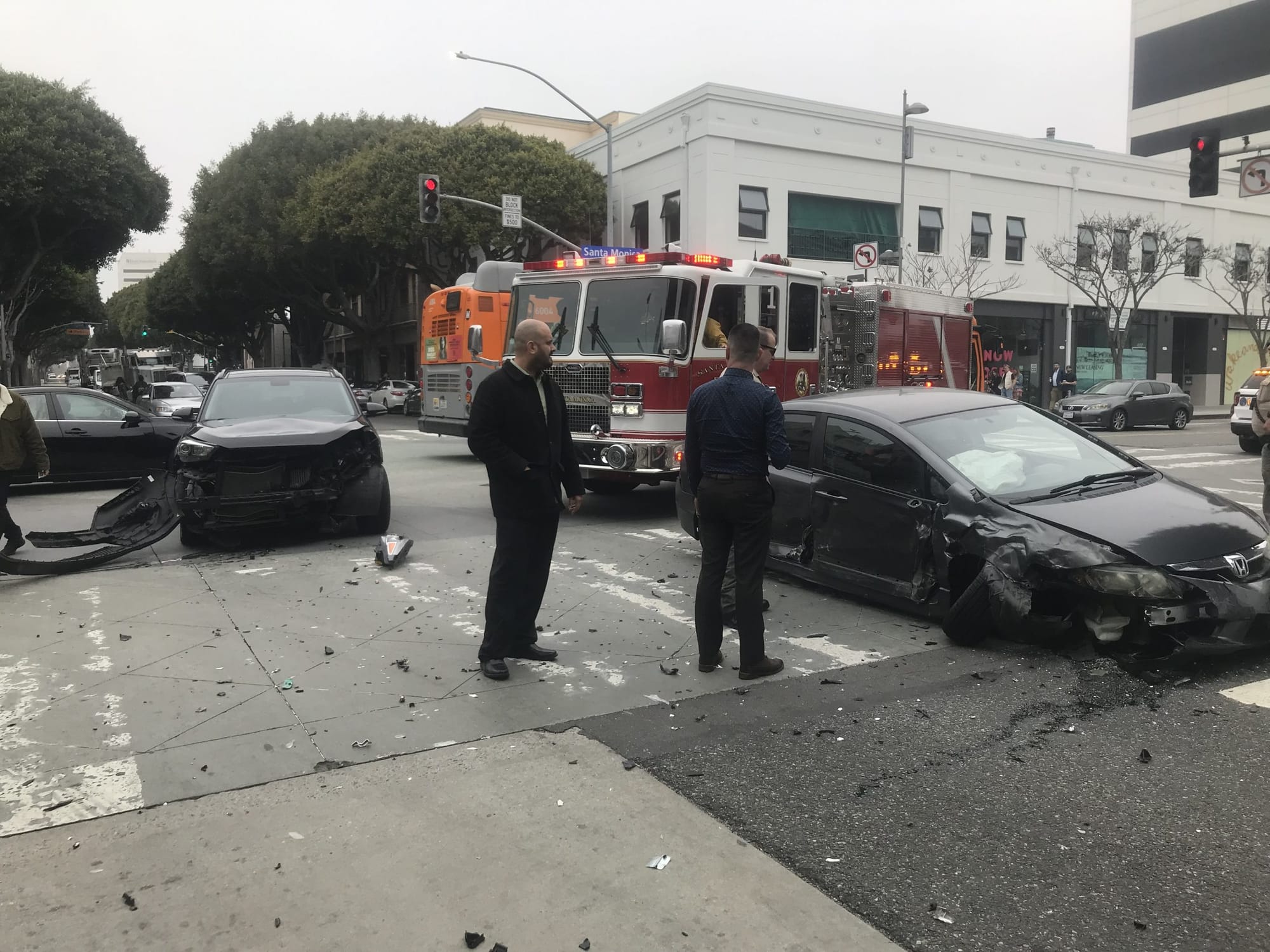 A dark gray Honda Accord sped across the intersection at Santa Monica Blvd and 4th Street, traveling north to south, against the traffic lights. It struck a second vehicle, traveling west to east on a green light with such force, that the second vehicle spun 90 degrees.
