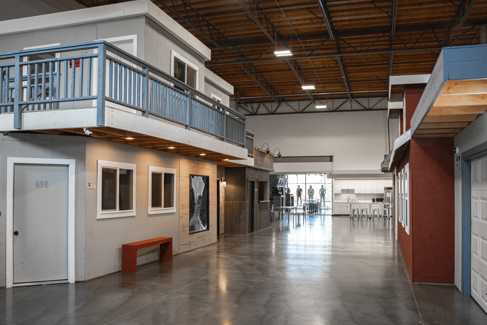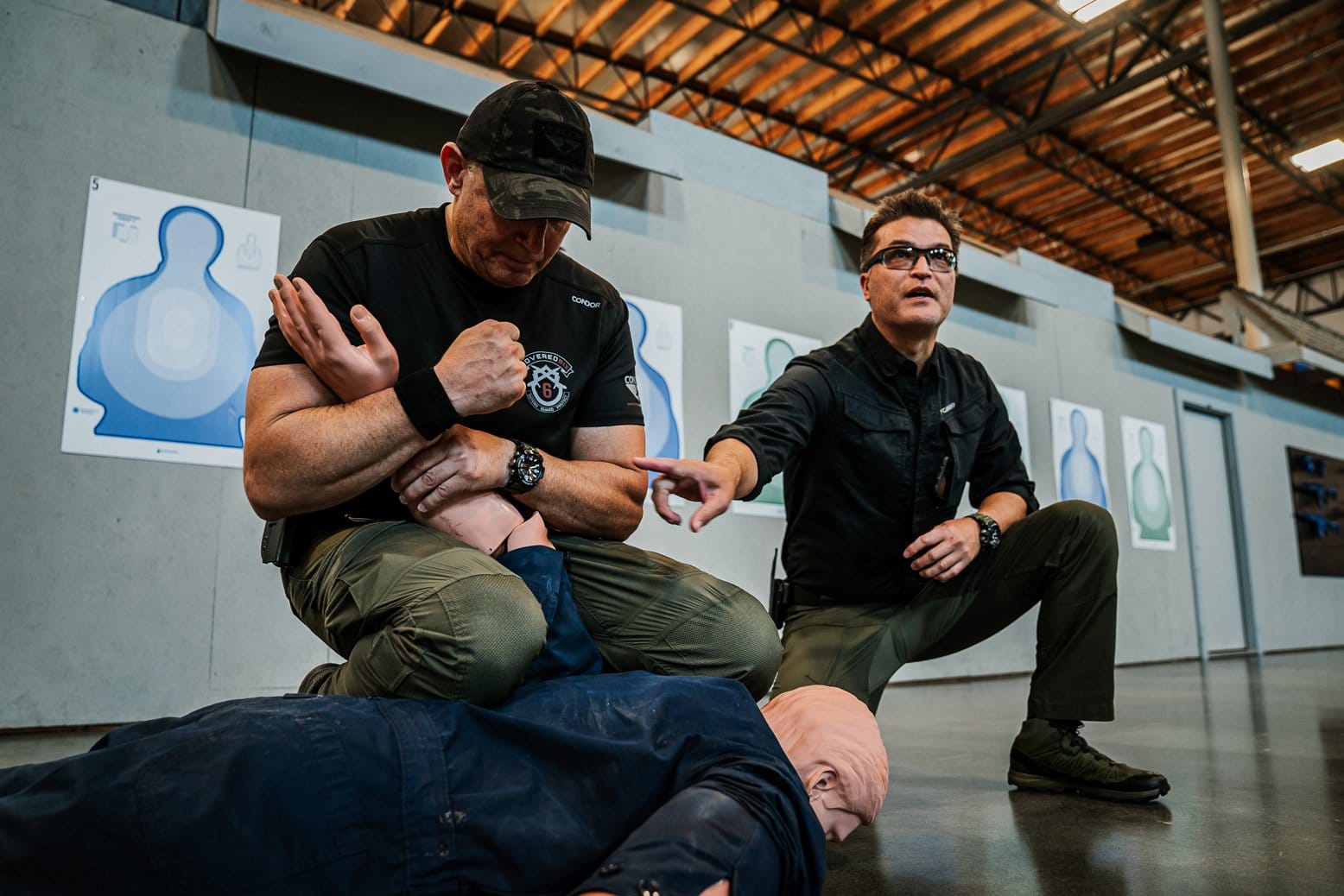 The rest of the ground floor is taken up by a vast, aircraft hanger-sized indoor training area that includes a full-size replicated street, complete with a fully functioning pub, apartments and even a teeny-tiny nightclub, where fundamentals like restraint in a crowded environment are taught. There’s a well-equipped gym and a large matted area where unarmed arts including judo, jiu-jitsu, karate and krav maga are practiced and perfected.