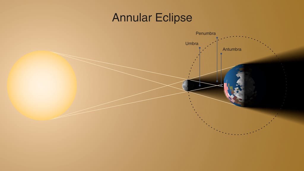 During an annular eclipse, the Moon is still centered in front of the Sun, but doesn’t completely obscure it, instead a spectacular ring of sunlight is visible around the Moon’s outer edges. This circle of light is called an annulus, or sometimes a "ring of fire" and only happens when the Moon is at the furthest point from Earth (at its apogee) making it appear slightly smaller than usual.