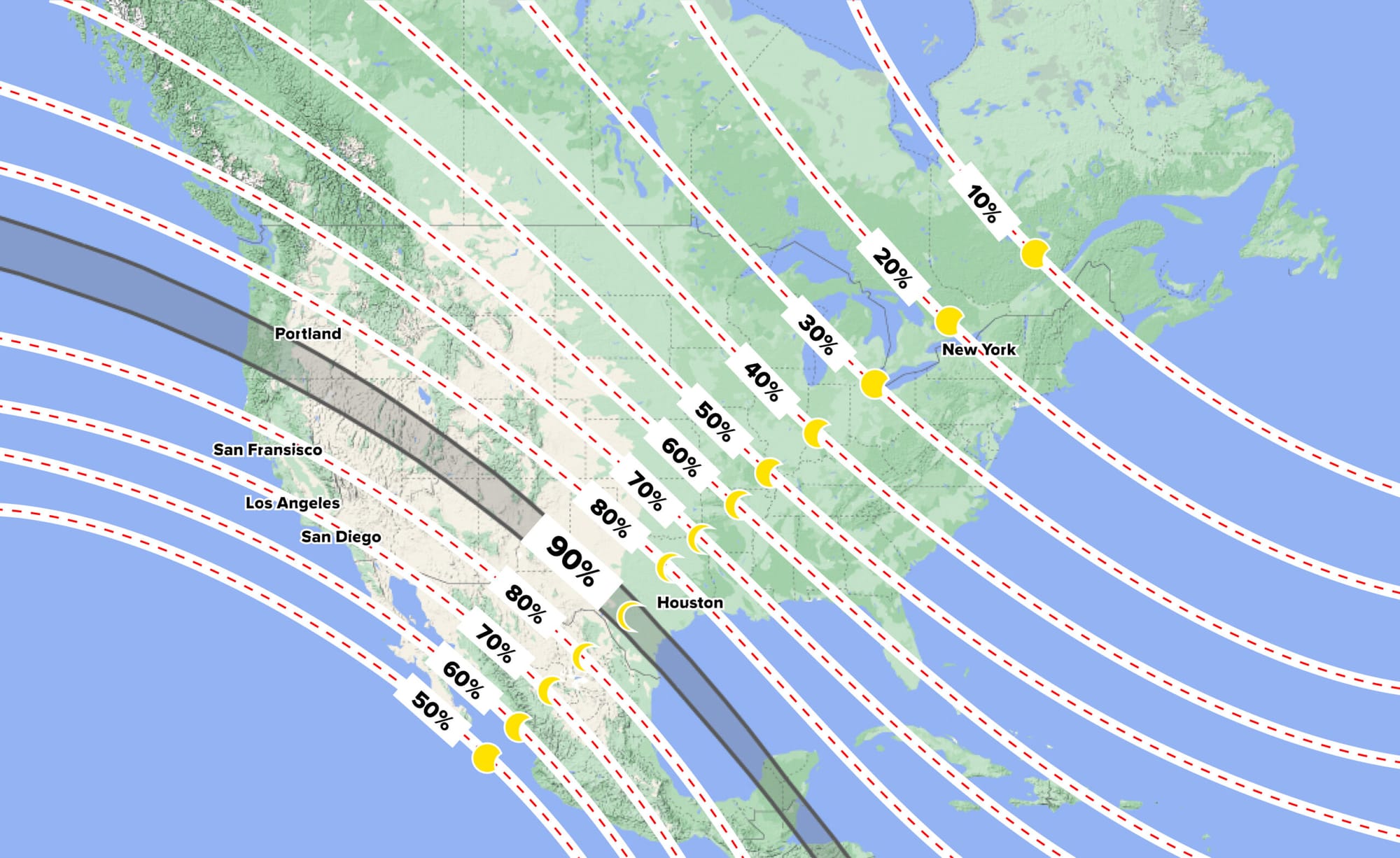 "It’s an unbelievable phenomenon that reminds us a bit of our small place in the cosmos," Laderman says. "You know, the speed of the Moon’s shadow as it races across North America will vary from more than 550,000 mph [more than twice the speed of a bolt of lightning] to 5,683 mph [about three times the speed of a rifle bullet]. And as it leaves the coast of Texas, it will have slowed down to 1,772 mph [more than twice the speed of sound]."
