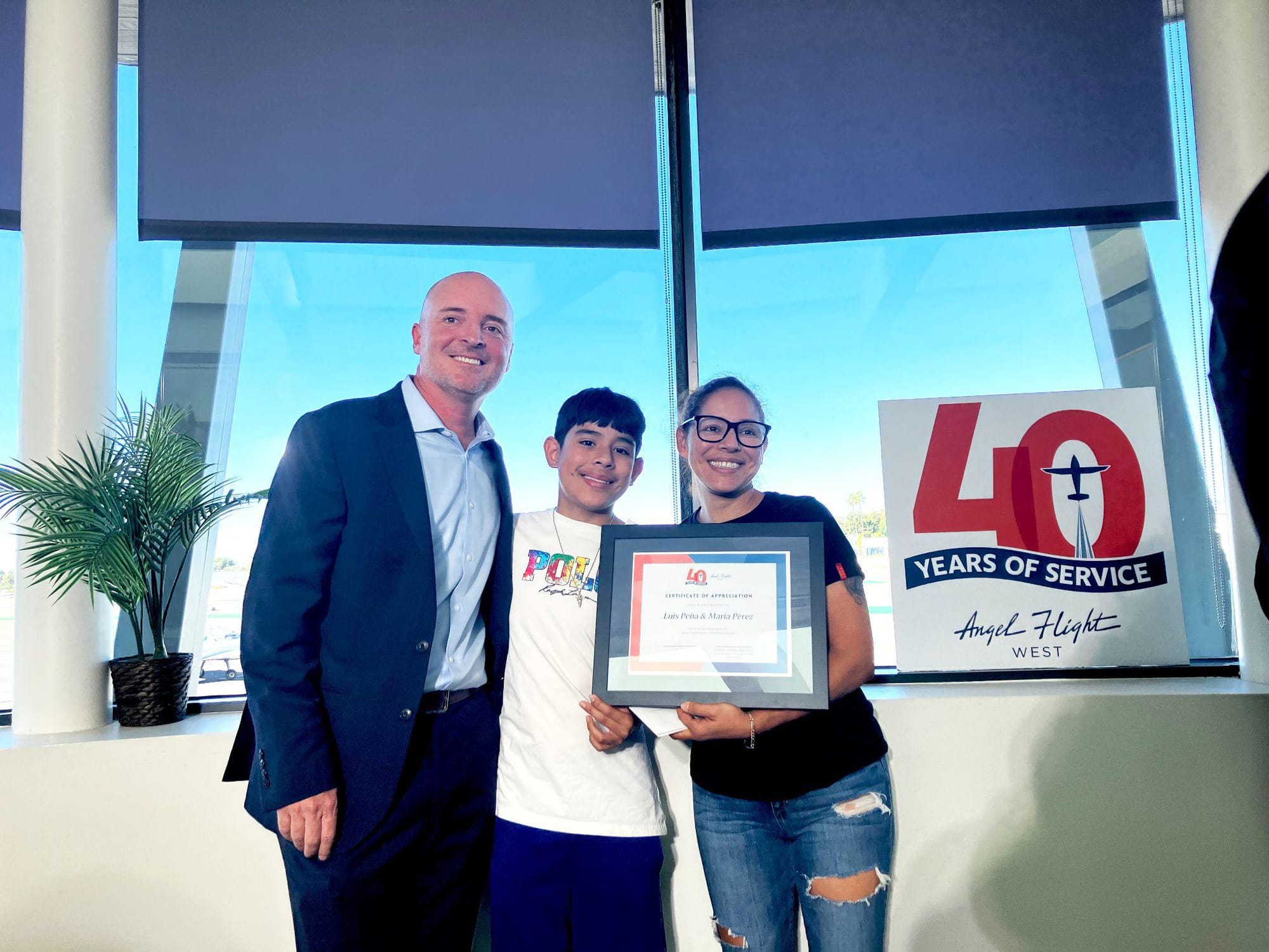 Santa Monica-based Angel Flight West (AFW) celebrated its 100,000th mission on Monday as actor and new AFW recruit Edward Norton flew young Luis and his mother Maria back to San Diego following his post liver transplant treatment.