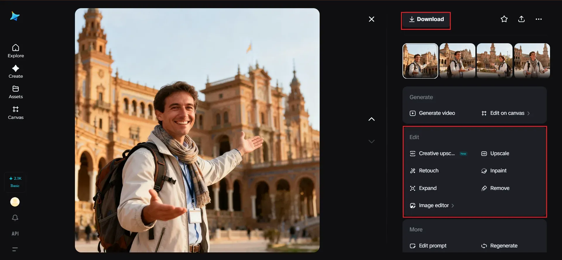 Once you have generated your image, you will then be able to refine your design using Dreamina's AI-powered customization features, such as "inpaint," "expand," "remove," and "retouch," which will help you refine your avatar until it perfectly captures your vision of a travel guide avatar. Once you are ready, you will then click on the "download" icon and download your avatar for use in your virtual tours or travel marketing campaigns.