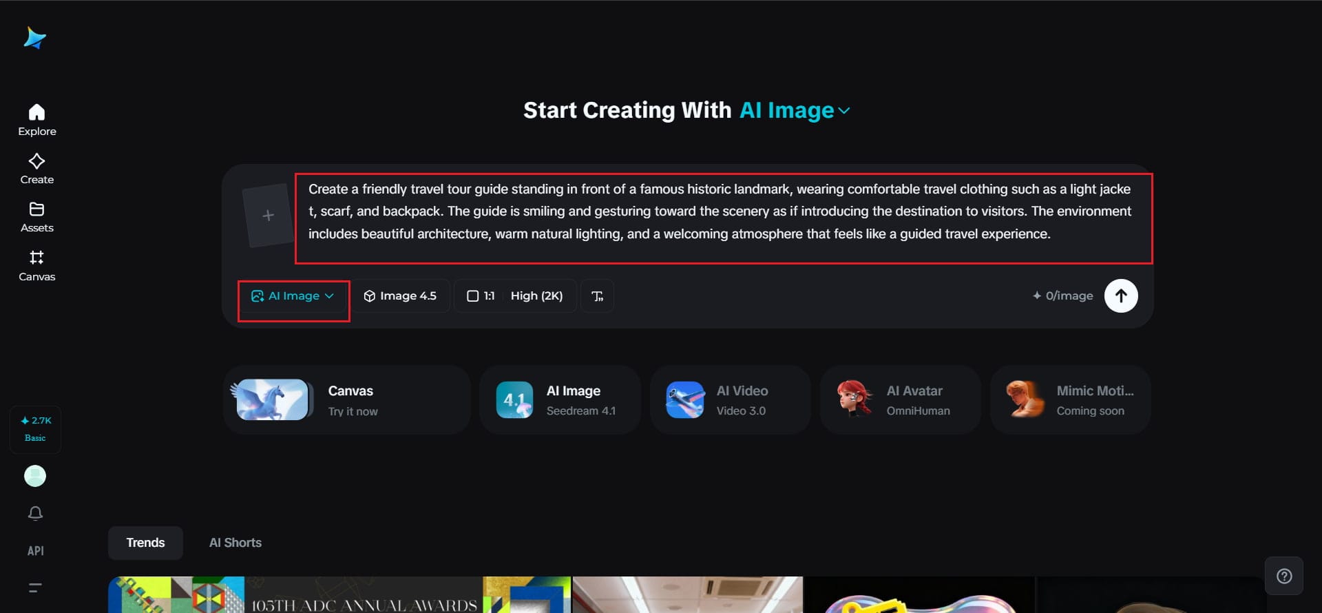 The first step to creating your tour guide avatar is to write a prompt. This is done on the creation interface provided by Dreamina. Instead of choosing a template, you write a prompt detailing the look and setting of your tour guide avatar. This includes details such as clothing, setting, and personality to make your tour guide more believable for your travel story.For example, Create a friendly travel tour guide standing in front of a famous historic landmark, wearing comfortable travel clothing such as a light jacket, scarf, and backpack. The guide is smiling and gesturing toward the scenery as if introducing the destination to visitors. The environment includes beautiful architecture, warm natural lighting, and a welcoming atmosphere that feels like a guided travel experience.This prompt provides Dreamina with the information it needs to create a believable tour guide avatar for your travel story.