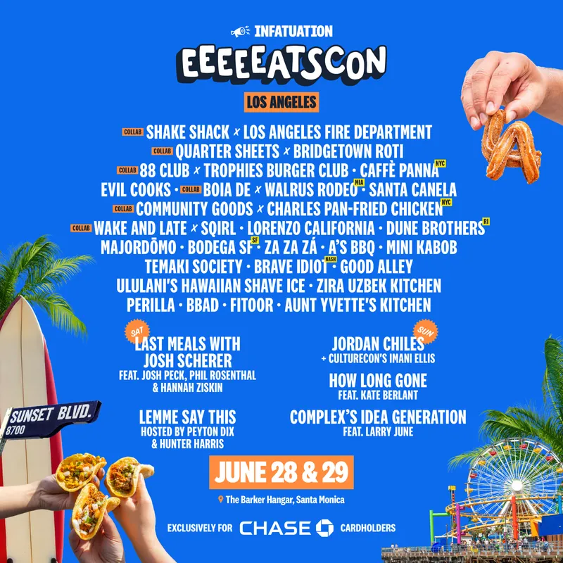 The Infatuation's EEEEEATSCON Los Angeles will return to The Barker Hangar in Santa Monica for its annual food festival on June 28-29, featuring more than 20 restaurants, celebrity guests and efforts to support Los Angeles wildfire relief.