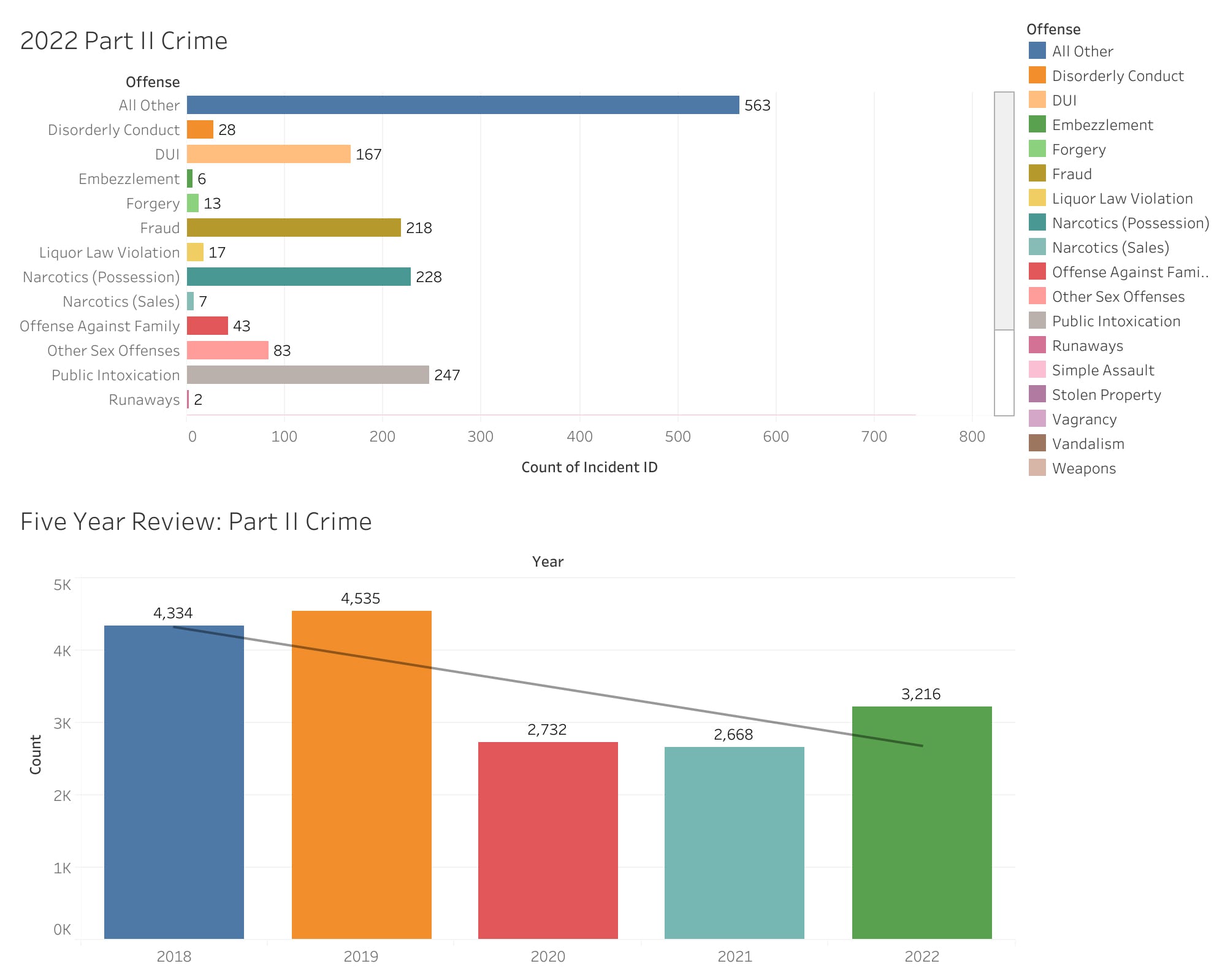 Part I and Part II crimes, which include the most severe crimes such as homicide, rape and aggravated assault, both increased in the City in 2022. Part I crimes were up by 10% from 2021 and Part II crimes by 21%.
