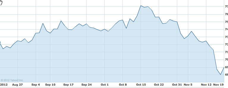 2. Wal-Mart stock is starting to look pretty good. It seems to be going up every year, and as it fixes its website it seems to be a better competitor for Amazon. And, as I see it, Internet shopping with quick delivery is where it's at now. The new smart phone feature, to help you find stuff in the stores, seems like a good idea. With a 2.3 percent dividend and a 14 PE, at anything under $70 it seems like a good buy. Here's how it looked over the past three months: