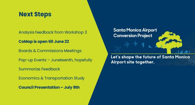 A preferred scenario will be developed in Fall 2025 following community input and City Council direction, with Environmental Impact Report proceedings to follow in 2026. The timeline aims to have development plans ready before the airport's possible closure on December 31, 2028.