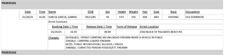 As officers arrived, operators from the Drone First Responder unit piloting Sky-1 (SMPD's unmanned aerial surveillance drone) observed a suspect, Gabriel García García, manipulating a handgun at the trunk of his parked car. The suspect was contacted and arrested without incident. Officers found two loaded 9mm handguns inside the suspect's car.