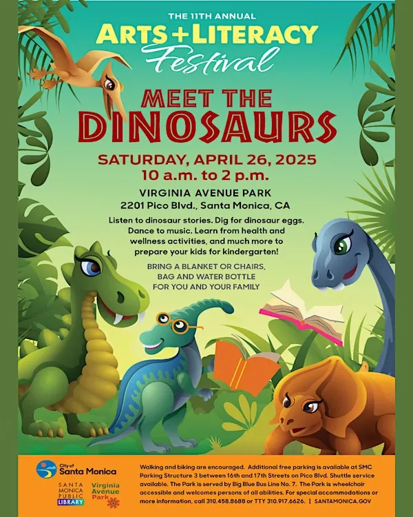 Virginia Avenue Park Art & Literacy Festival: This year’s theme is “Dinosaurs!” and the event will host over thirty different community organizations offering games and activities that align with the Santa Monica Cradle to Career Building Blocks for Kindergarten (BBK) campaign. Building Blocks for Kindergarten promotes social and emotional development, self-care, physical well-being and motor skills, language development and early learning to help parents, educators, early childcare providers, and other community partners work together to make sure all Santa Monica children start kindergarten ready to learn, inside and outside the classroom. FREE. Saturday, April 26, 10 a.m.-2 p.m., 2200 Virginia Ave. https://www.santamonica.gov/events/4tjtyk3dgj04fr4300har4c351/202504261000