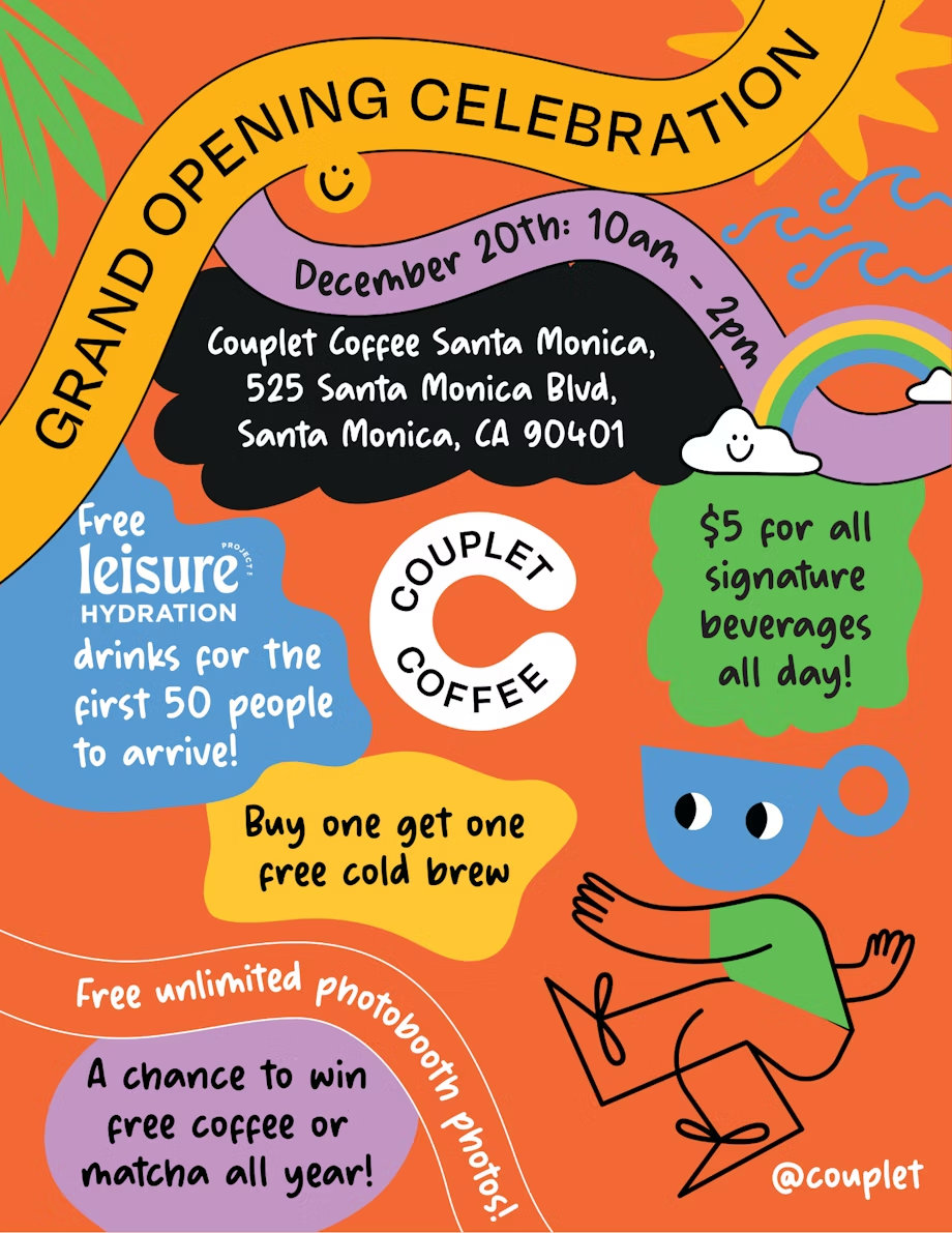 Couplet Coffee Santa Monica Grand Opening Party: Come on by for freebies and festivities. Fresh donuts by @OryanCooks. Free Leisure Hydration bevvies for the first 50 customers. Saturday, Dec. 20 10a.m. – 3p.m., 525 Santa Monica Blvd. https://partiful.com/e/xcr6lmcvmxHzTVd1ZOc7