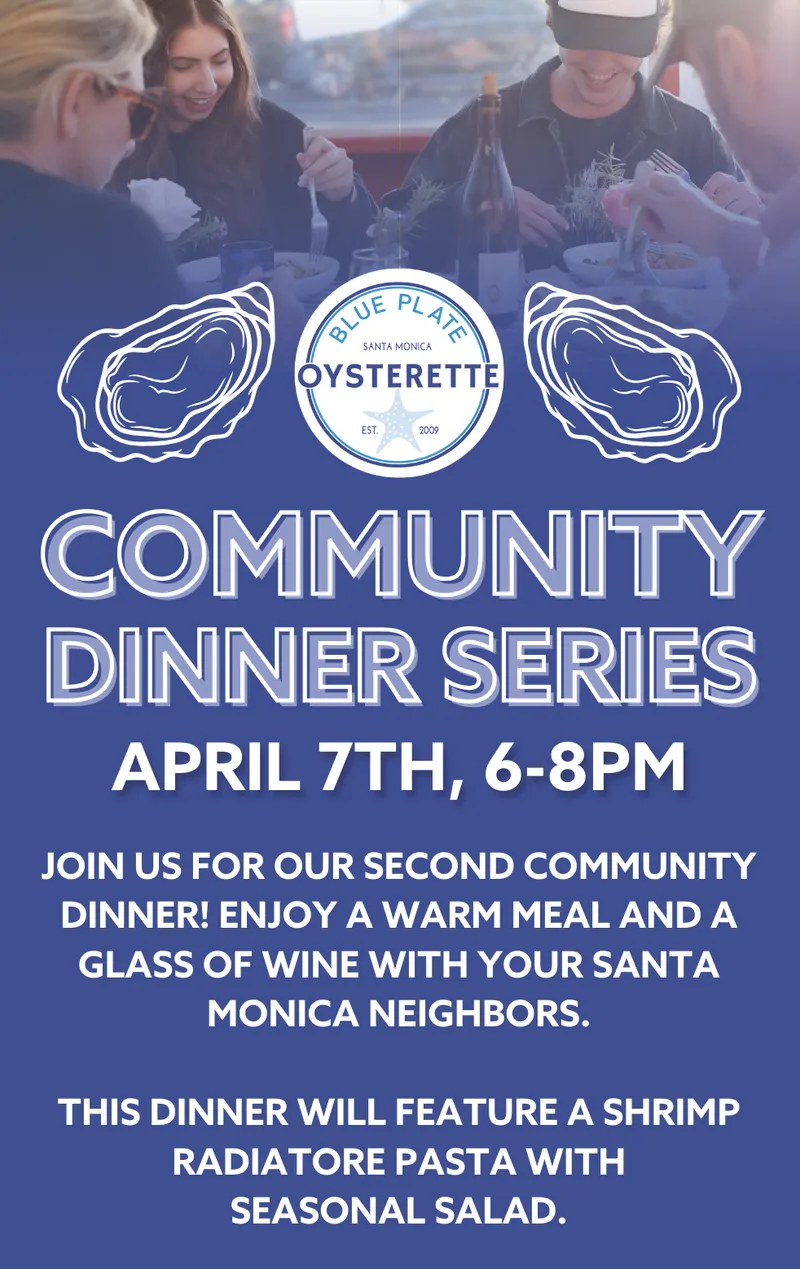 Blue Plate Oysterette Community Dinner Series: Join us for a gourmet dinner at sunset for $29. Enjoy a chef-curated meal, mingle with your Santa Monica neighbors, and soak in the sunset from our communal table. This dinner will feature shrimp radiatore pasta with seasonal salad. Monday, April 7, 6 - 8p.m., 1355 Ocean Ave. https://www.eventbrite.com/e/bpo-community-dinner-series-tickets-1281400245629