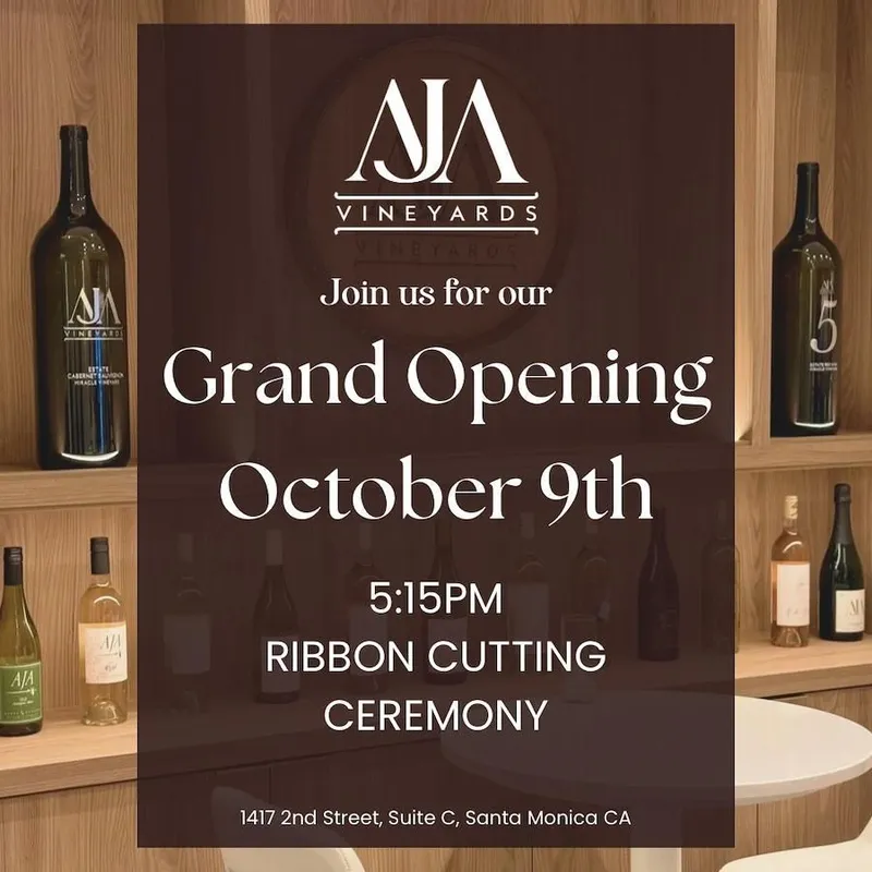 AJA Vineyards Tasting Room Grand Opening: The Malibu winemakers are opening Santa Monica's 'First Ever Winery Tasting Room' at 1417 2nd St on Wednesday, Oct. 9 with a ribbon-cutting ceremony at 5:15pm. And on Sunday, Oct. 13 they are offering free Paella starting at 1pm until they run out. The space will offer wine flights, glasses and bottles. Details here.