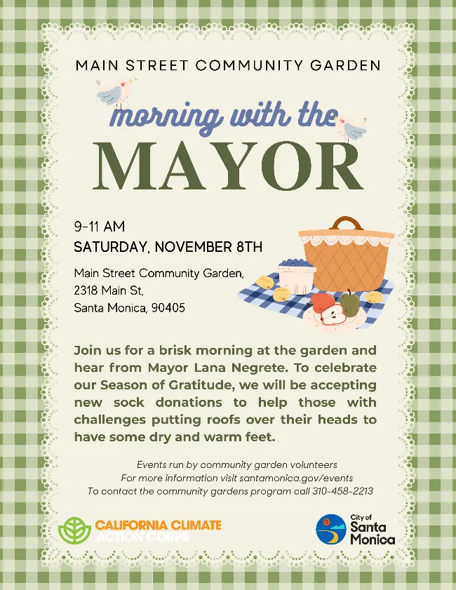 A Morning with Our Mayor @ the Main Street Community Garden: Stroll through this unique habitat which has hundreds of plant varieties, insects and a seemingly endless supply of ideas for your home garden. Our team of dedicated and seasoned gardeners will have vegetable and flower seeds for distribution, warm coffee, fresh pastries, and plenty of tips on what to plant and the techniques which are most successful. Saturday, Nov. 8, 9 - 11a.m., 2318 Main St. santamonica.gov/events/4n0rcec226geqr1dr3bxg6qk4f/202511080900