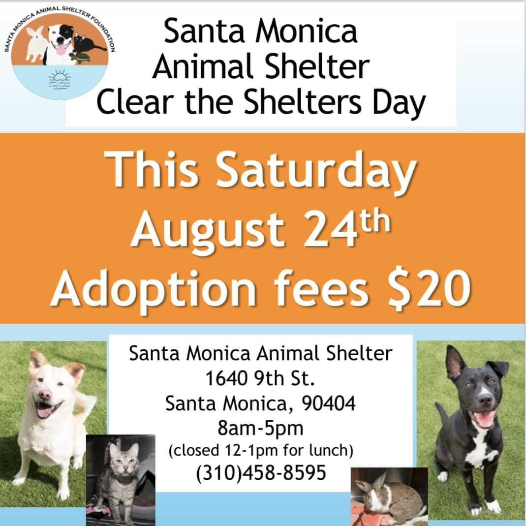 Clear the Shelter Day at the Santa Monica Animal Shelter. This Saturday, the Santa Monica Animal Shelter is hosting its annual Clear the Shelter Day, moreover the adoption rates have been lowered to just $20, so pop down to 1640 9th Street between the hours of 8-5pm and help transform the lives of all those little love bundles and you might even find your four-legged soul mate. Saturday, August 24, 1640 9th Street, Santa Monica, 8am–5pm. Would you like to know more?