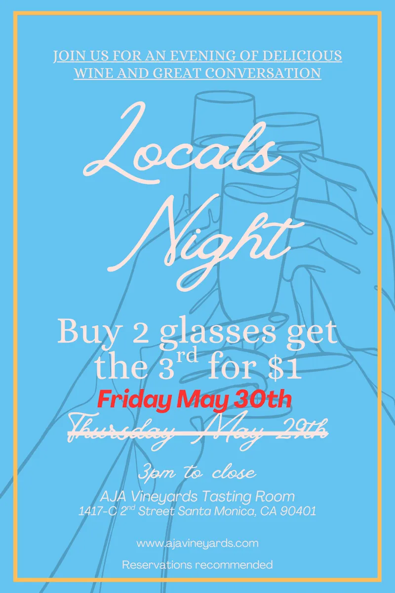AJA Vineyards Locals Night: Kick off the summer right with the perfect evening at your local Santa Monica winery. If you live in Santa Monica or the surrounding Los Angeles area, come enjoy 2 glasses of wine and get the 3rd for $1. Friday, May 30, 1417 2nd St. https://ajavineyards.com/upcoming-events/