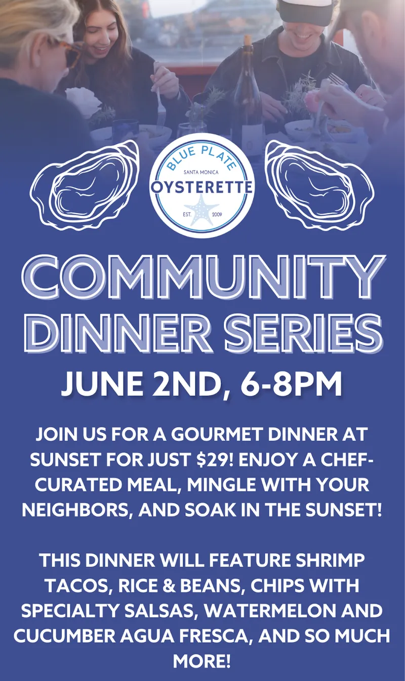 Blue Plate Oysterette Community Dinner Series: Join a gourmet dinner at sunset for $29. Enjoy a chef-curated meal, mingle with your Santa Monica neighbors, and soak in the sunset from our communal table. This dinner will feature shrimp tacos, rice and beans, chips with specialty salsas, watermelon and cucumber agua frescas and more. Monday, June 2, 6 - 8p.m., 1355 Ocean Ave. https://www.eventbrite.com/e/bpo-community-dinner-series-tickets-1333332235609