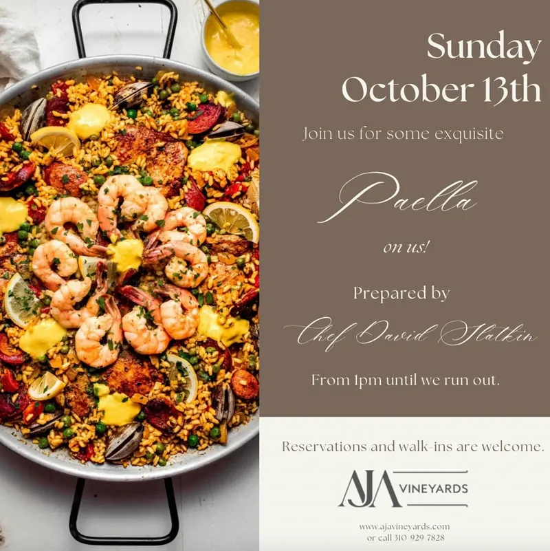 AJA Vineyards Tasting Room Grand Opening Free Paella Party: The Malibu winemakers are opening Santa Monica's 'First Ever Winery Tasting Room' at 1417 2nd St. and on Sunday, October 13 they are offering free Paella starting at 1pm until they run out. The space will offer wine flights, glasses and bottles. More info here.