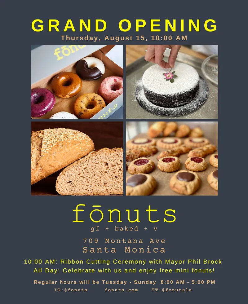 Fōnuts Grand Opening: They'll be officially celebrating with a Grand Opening Ribbon Cutting Ceremony, led by the Mayor of Santa Monica, Phil Brock. They'll be handing out free mini fonuts while supplies last, and showcasing all their new bread, cakes, and pastries, and of course all the fonuts. Thursday, August 15 at 10am at 709 Montana Ave. Details here.