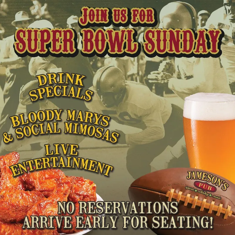 Super Bowl Party at Jameson's Pub: Indulge in $5.99 Peanut Butter Jameson shots, $4.99 draft beer specials, and triple-sized cocktails starting at $19. Arrive early for seating!