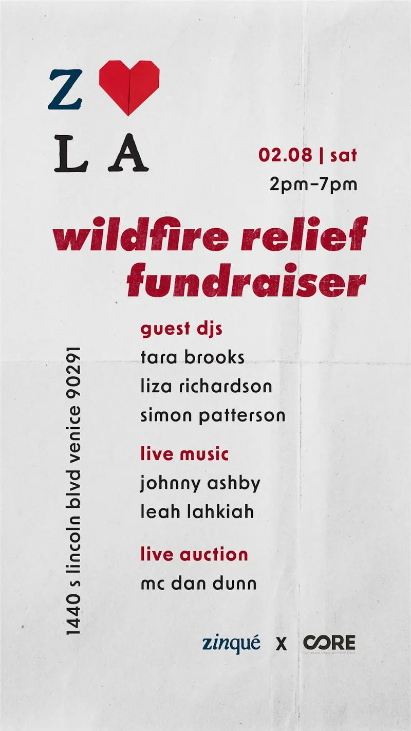 Zinqué Loves LA Wildfire Relief Fundraiser: In collaboration with CORE, zinqué will be hosting a fundraiser & auction to support LA wildfire relief at their Venice flagship location with live music, an auction, and more. Saturday, Feb. 8, 2 –7 p.m., 1440 S. Lincoln Blvd., Venice https://www.lezinque.com/community