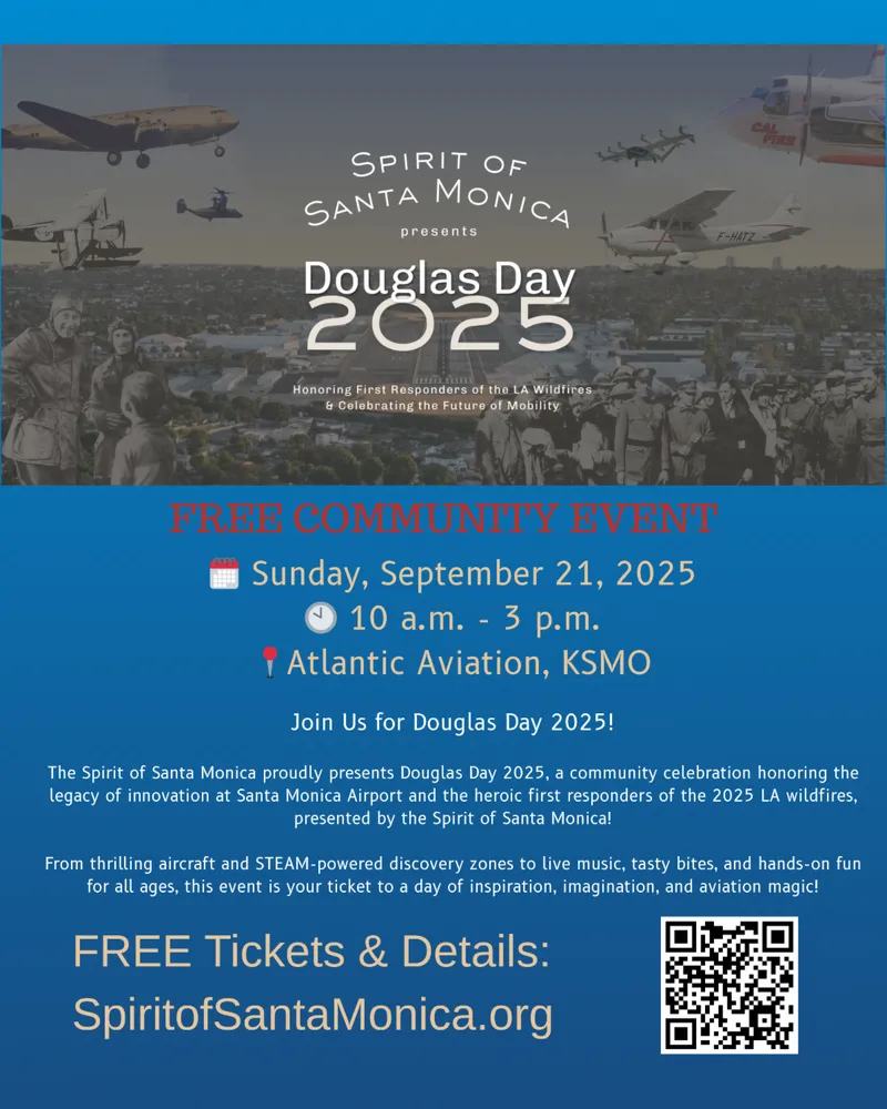 Douglas Day 2025: This community celebration honors the legacy of innovation at Santa Monica Airport and the heroic first responders of the 2025 LA wildfires, presented by the Spirit of Santa Monica. From thrilling aircraft and STEAM-powered discovery zones to live music, tasty bites, and hands-on fun for all ages, this event is your ticket to a day of inspiration, imagination, and aviation magic. Saturday, Sept. 21, 10 a.m. – 3 p.m., Santa Monica Airport https://www.spiritofsantamonica.org