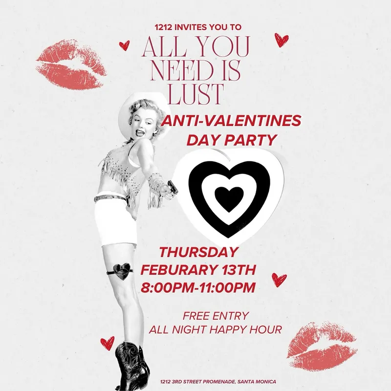 1212 Santa Monica’s Anti-Valentine’s Day: “All You Need is Lust,” an all-night happy hour on a private patio featuring themed drinks, games, and pool tables. It’s a singles-only affair—no lovebirds allowed. Thursday, Feb. 13, starting at 7 p.m. FREE. https://www.1212santamonica.com/event/anti-valentines-day/