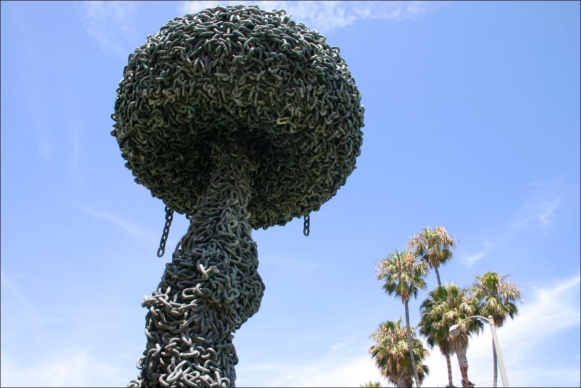 "Chain Reaction," a 26-foot-tall statue shaped like a mushroom cloud made by three-time Pulitzer Prize-winning cartoonist Paul Conrad, has been at risk of being removed from its spot in the Civic Center since a building and safety official saw children climbing on it and asked for a review of its integrity.