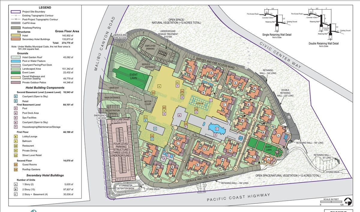 Initially marketed as the Rancho Malibu Mesa Development, or Adamson Hotel, developers first envisioned a 300-room hotel including private villas, a separate 10,000-square-foot restaurant and a community facility, in plans presented in 1984. Back then, all of Malibu was unincorporated county land.