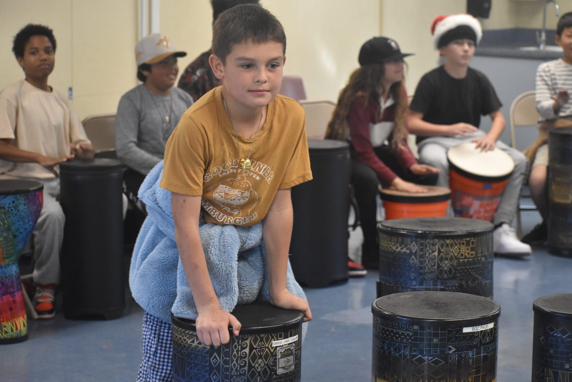 On Dec. 13, seventh-grade student mentors from John Adams Middle School visited the fifth-grade classroom of Kim Griffin at Will Rogers Learning Community, bringing the boom of the drums to form a circle of community. The hour-long drum circle was one in a series of sessions provided by JAMS mentors, learning under the Arts & Healing Initiative’s “Beat the Odds” program.