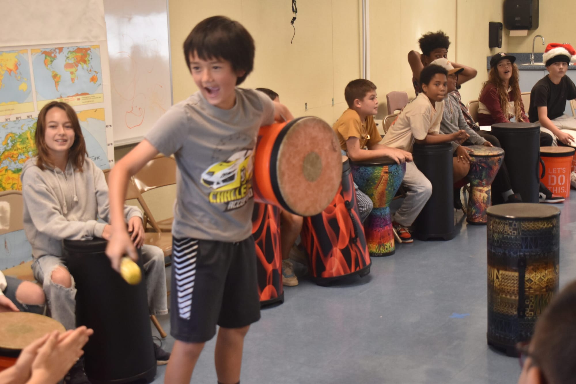 Ho proposed the program to JAMS with an excited response from staff, including JAMS Mental Health Counselor Nancy Gutierrez, who previously took the drumming training herself. Working with an average of 20 seventh-grade mentors for the past three months, JAMS kids had rehearsal time before delivering a class to Will Rogers fifth-graders, and eventually developed their own activities for the session. Ho added that teaching children to be mentors, rather than adults, can cultivate “a very large contingent of people who could actually make a difference in their community.”