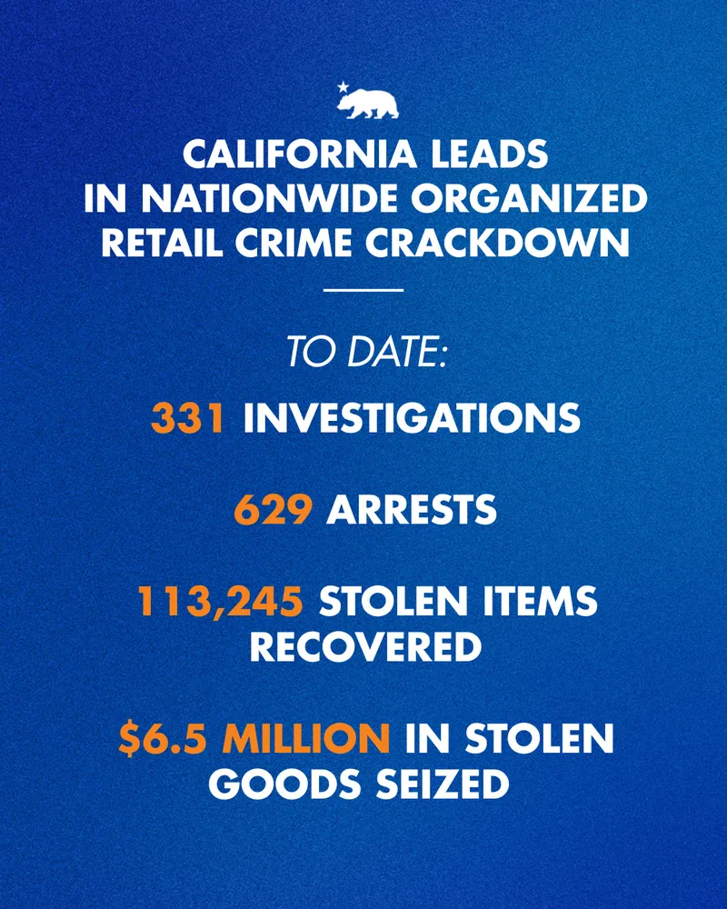 California's crackdown on organized retail crime has yielded significant results in the first five months of 2025, with law enforcement recovering nearly $6.5 million in stolen merchandise and making more than 600 arrests, Gov. Gavin Newsom announced recently.