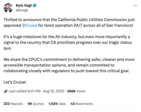 A small number of protesters gathered outside the CPUC offices on Van Ness Ave to demonstrate, holding signs with messages like “Put the brakes on AVs!!” and “Put the brakes on Cruise and Waymo” and comments on social media were an entertaining mix, albeit mostly positive, with Kyle Vogt, CEO and Co-founder at Cruise, tweeting, “It’s a huge milestone for the AV industry, but even more importantly a signal to the country that CA prioritizes progress over our tragic status quo.”