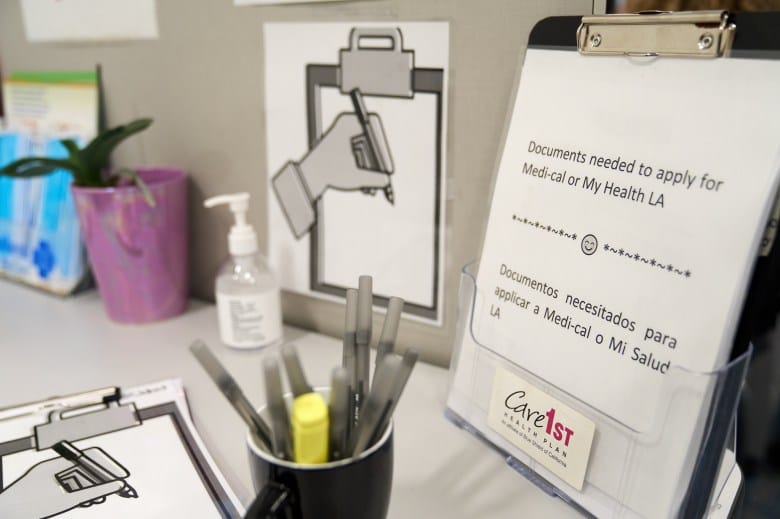 Perla Lopez hands a stack of papers to Baudeilio, a 44-year-old undocumented immigrant and day laborer. She has just helped him apply for Medi-Cal at the benefits center at St. John’s Community Health’s in South Los Angeles.