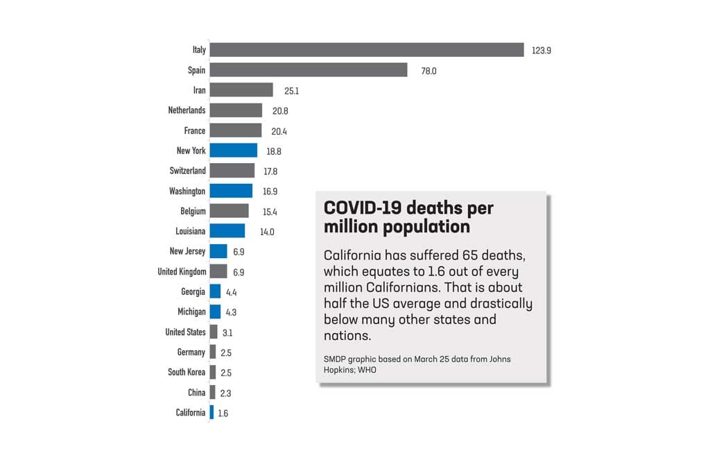 As the graph indicates, California has experienced a very low death rate to date compared to other areas with significant COVID-19 outbreaks.