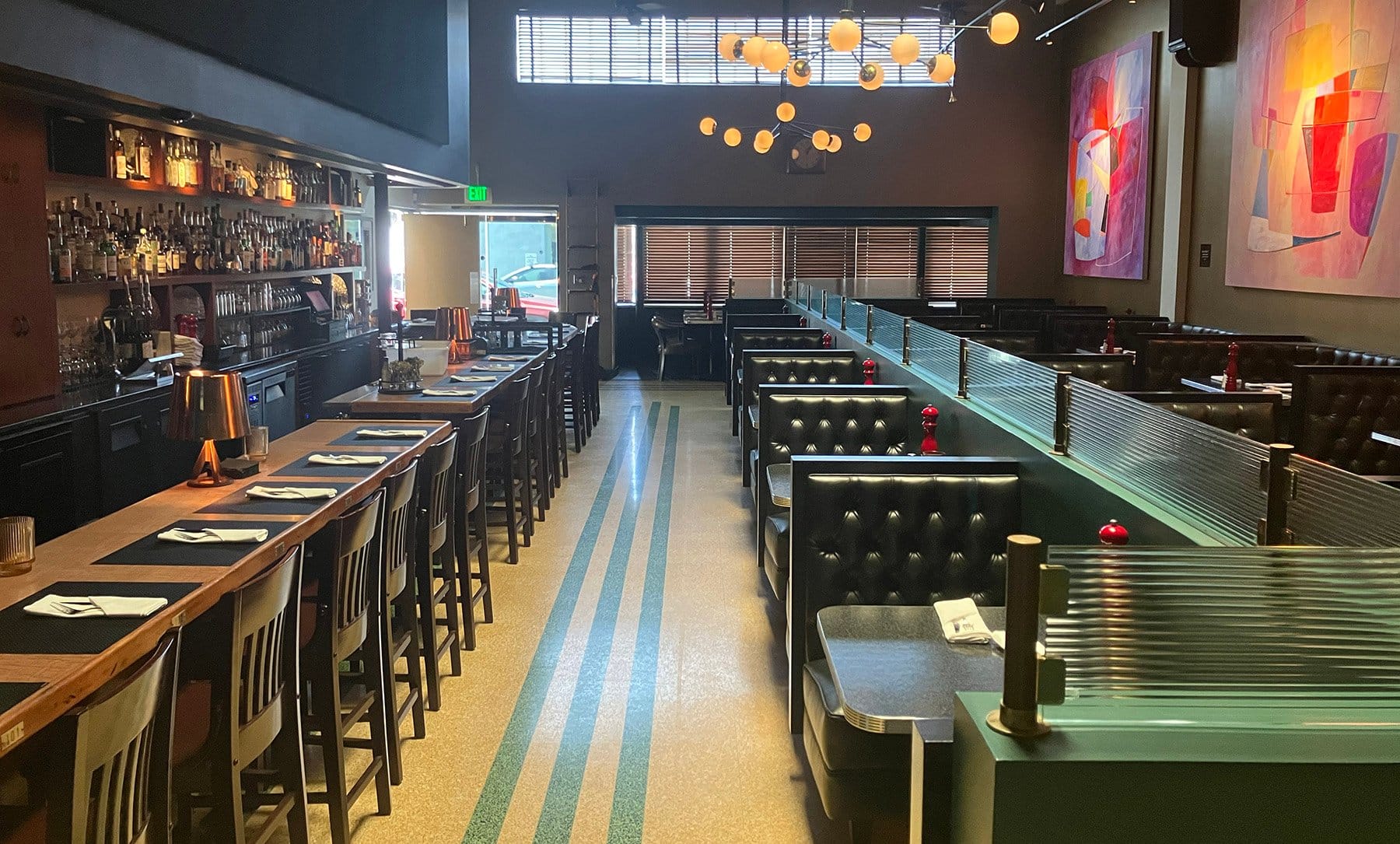 The space, formerly Ingo’s Tasty Diner, has undergone a meticulous transformation. The building itself is one of the last true examples of authentic Art Deco Streamline Moderne design in the area, and has been nominated for a second time by the Santa Monica Conservancy for its adaptive reuse and preservation. Outside, a bold neon sign greets guests under curving chrome and soft stucco edges. Inside, warm neutrals, soft black leather and three large-scale paintings by Lynn’s wife, artist Sara Abbott, plus the original terrazzo floors remain intact, giving the space a refined but relaxed atmosphere.,