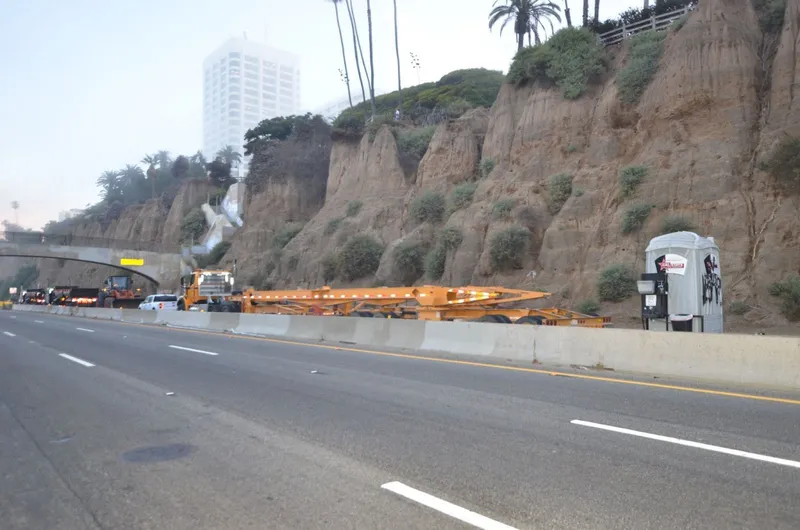 Residents, dog walkers, early morning joggers and just about everyone who was up and about at 5 a.m. this morning gathered to watch as a sizable engineering team closed off all northbound traffic on the Pacific Coast Highway and safely removed an unstable section of the Santa Monica Bluffs.