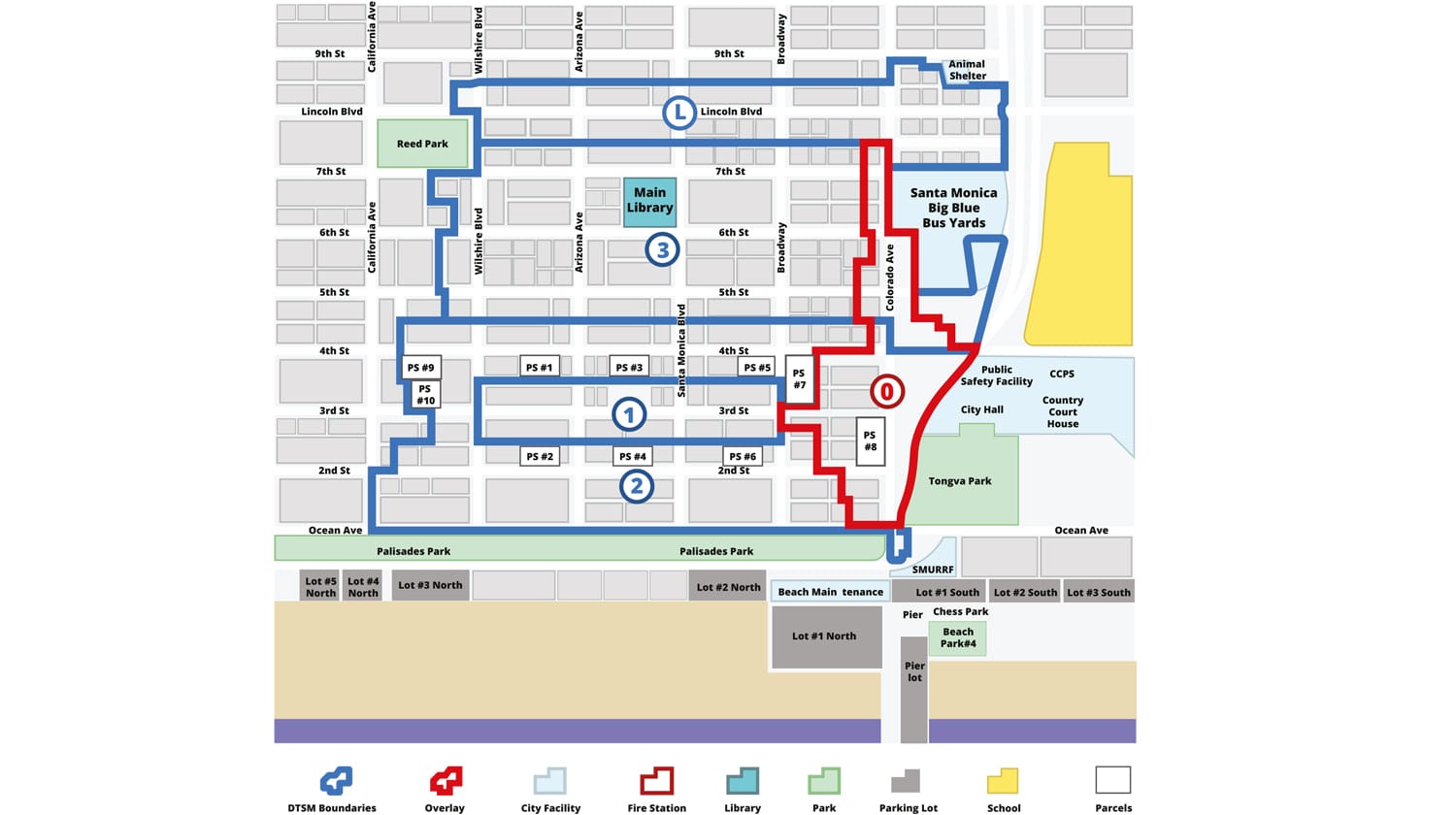 For the proposed plan, coverage of the Downtown area will break down as follows: Zone 1 represents the three block length of the Third Street Promenade. Zone 2 surrounds Zone 1, providing a larger perimeter extending to 4th Ct, Ocean Ave, California Ave and Broadway. Zone 3 covers the area between 4th Ct and 7th Ct and approximately Wilshire Blvd to Colorado Ave. Zone L is from 7th Ct to 8th Ct and runs from Wilshire Blvd to Olympic Blvd. Finally, Zone 0 is a higgledy-piggledy shape incorporating the Santa Monica Place Mall, the Metro E-Line station and a little bit of Colorado Ave.