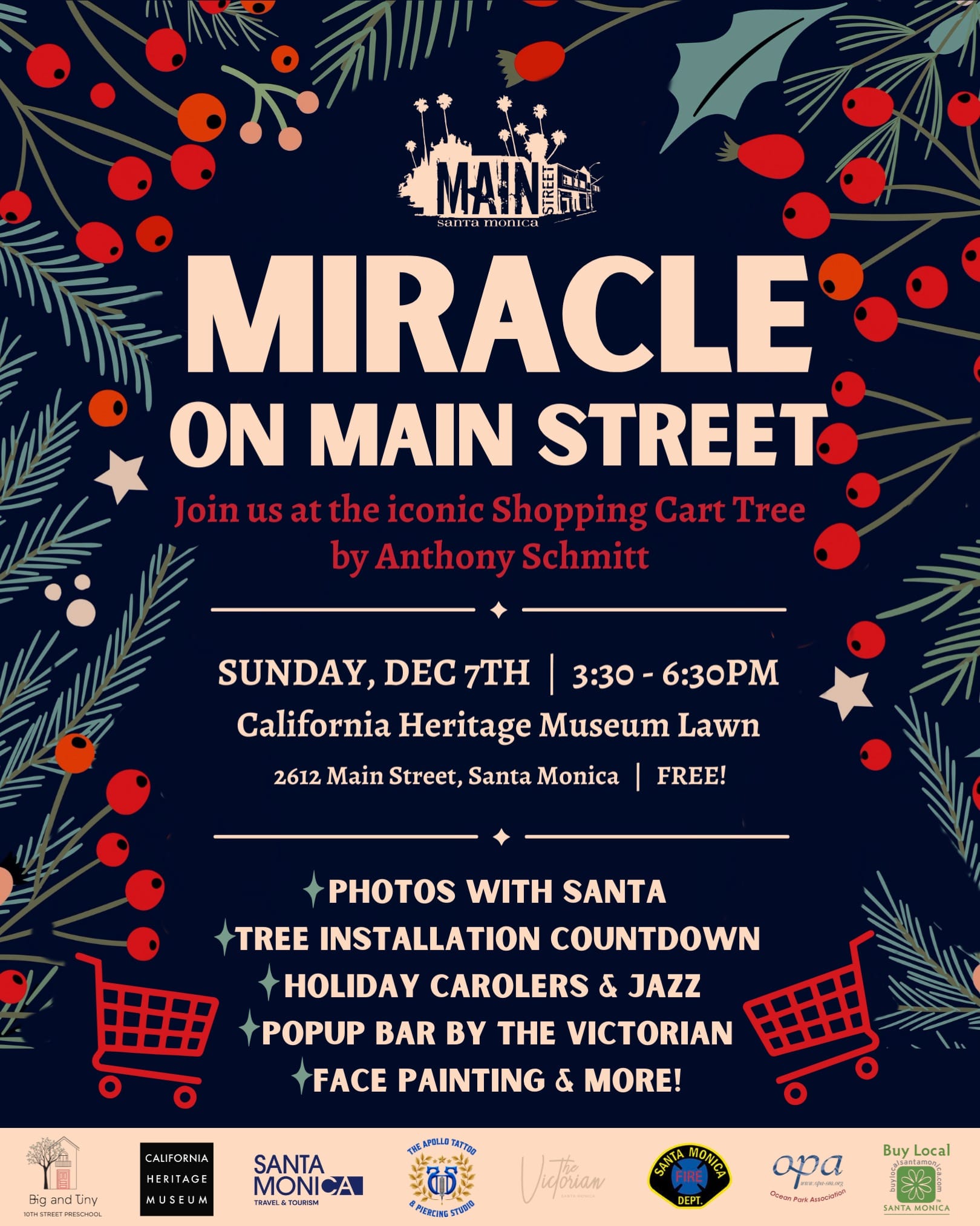 Miracle on Main Street Returns to Santa Monica on Dec. 7! Join the community for the annual Holiday Tree Lighting featuring the 20-foot Shopping Cart Tree, free photos with Santa, live music, kids’ crafts, a pop-up bar by The Victorian, and pizza from Triple Beam. The celebration begins after the Main Street Farmers Market and continues through the early evening. Sunday, Dec. 7, https://www.eventbrite.com/e/miracle-on-main-street-holiday-tree-lighting-tickets-1975036020905