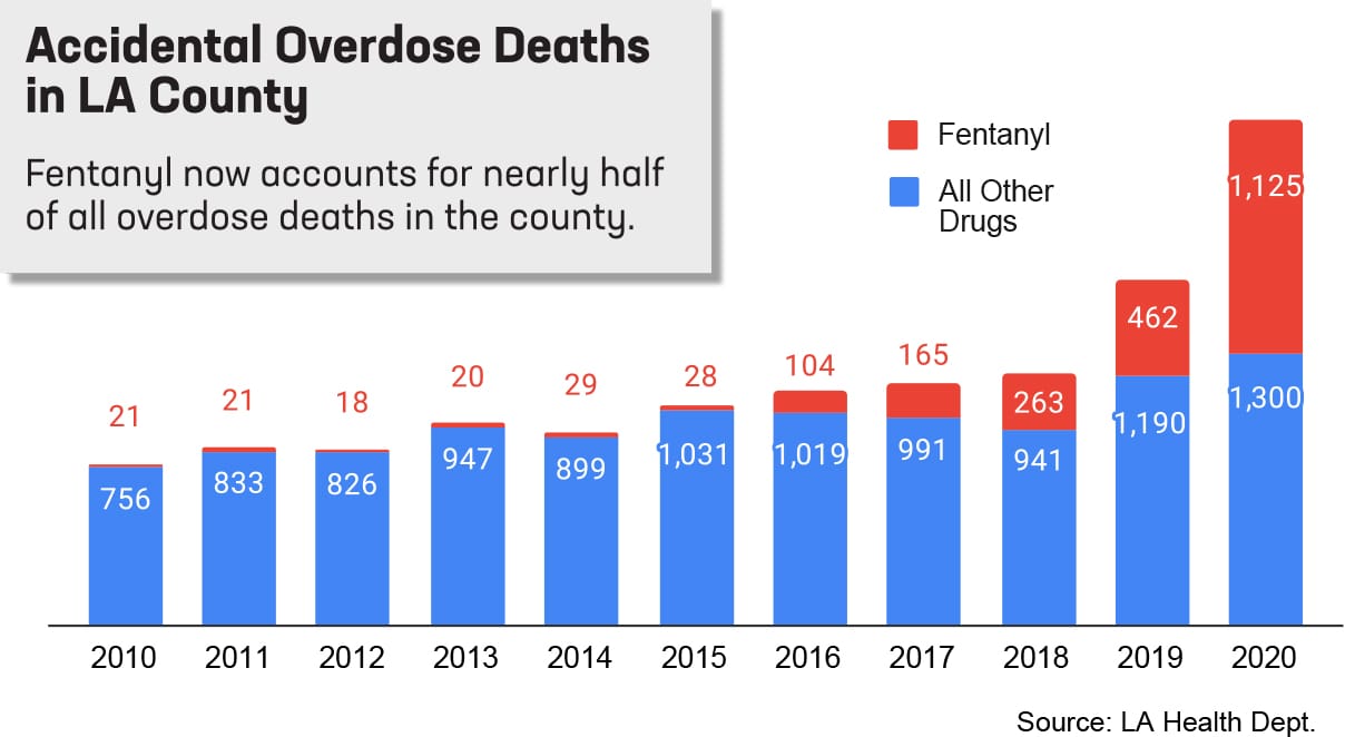 The numbers are just as shocking in Los Angeles where the Coroner’s office has reported total opioid deaths more than tripled between 2016 and 2020. According to the Prescription Drug Abuse Coalition of Los Angeles County, the number of fentanyl overdose deaths in the county increased every year since routine testing of fentanyl began in 2016. In 2020, fentanyl-related overdose deaths increased to 1,125, a 982% jump from 2016, and a 144% increase from the previous year.