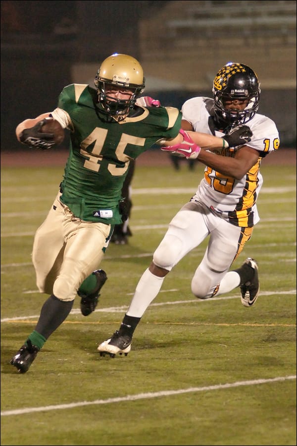 St. Monica’s Kevin Holubowski (left) fights off Boron’s DJ Payne on Friday at Santa Monica College. St. Monica won the second round CIF-Southern Section Northeast Division playoff game, 19-16. The Mariners will face Rio Hondo Prep in the semifinals on Friday.