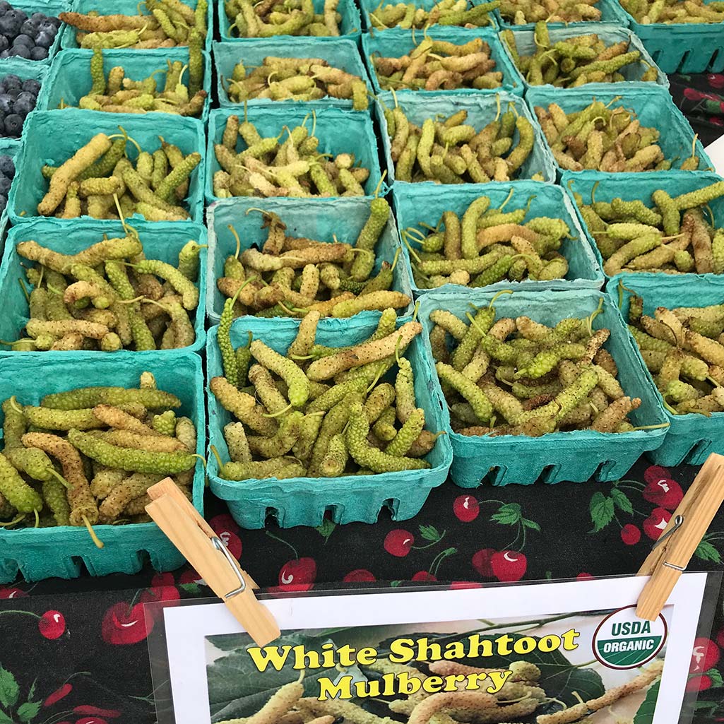 Jimmy Powell of Pudwill Farms sells a deep purple Pakistan mulberry grown on land that was once a turkey farm. Thanks to years of diligent fertilization by the birds, and careful seed selection by the farmers, Pudwill grows one kind of berry or another year round, including delicate black raspberries, also available now. But mulberry season, he said, will only last another two to four weeks.