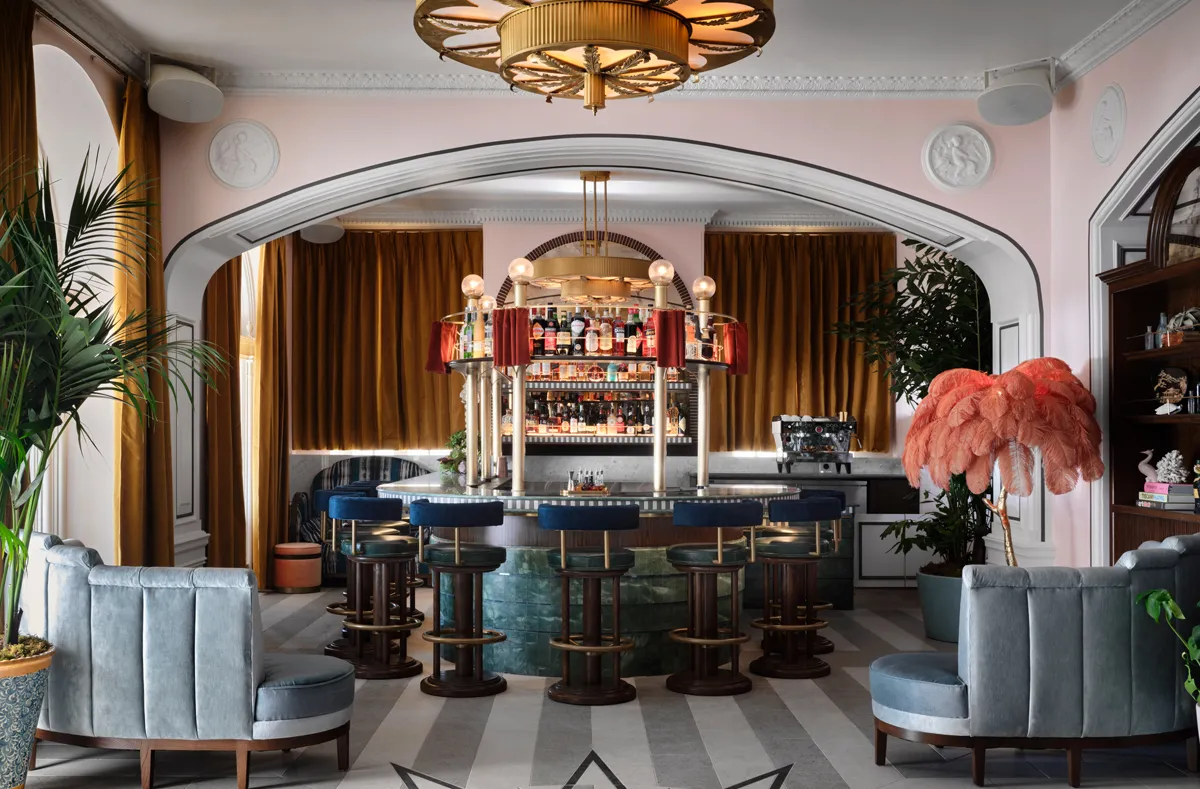 The official blurb sums the experience up rather well, "Guests walk upon a Havana Deco inspired floor as they cross the threshold into the Georgian’s historic lobby. High ceilings accented with custom Art Deco chandeliers and original decorative reliefs welcome travelers to the cinematic entryway, with the visually striking horseshoe-shaped Sunset Bar to the left, and intimate dining room to the right."