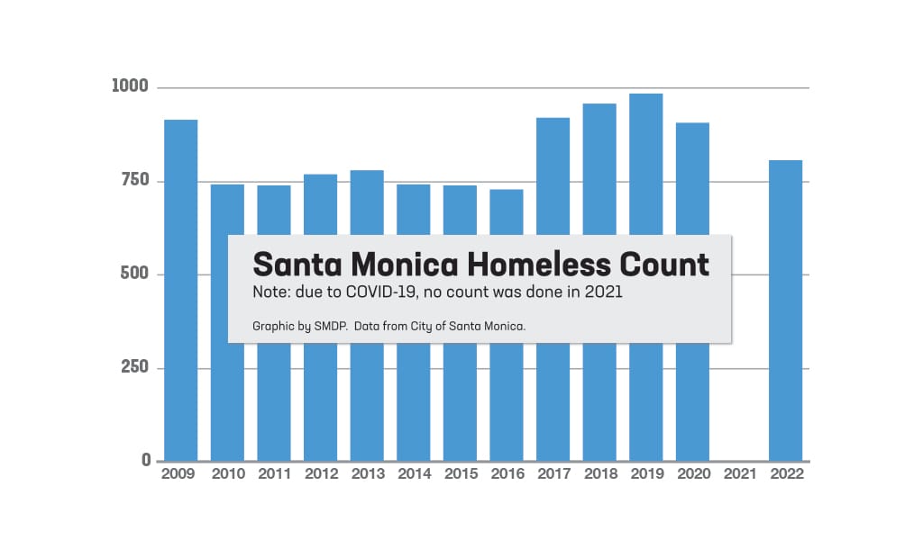 On the night of Feb. 23, 2022, volunteers counted 807 people living homeless in Santa Monica, either in tents and makeshift shelters, vehicles, sleeping rough on the street, or within homeless shelters.