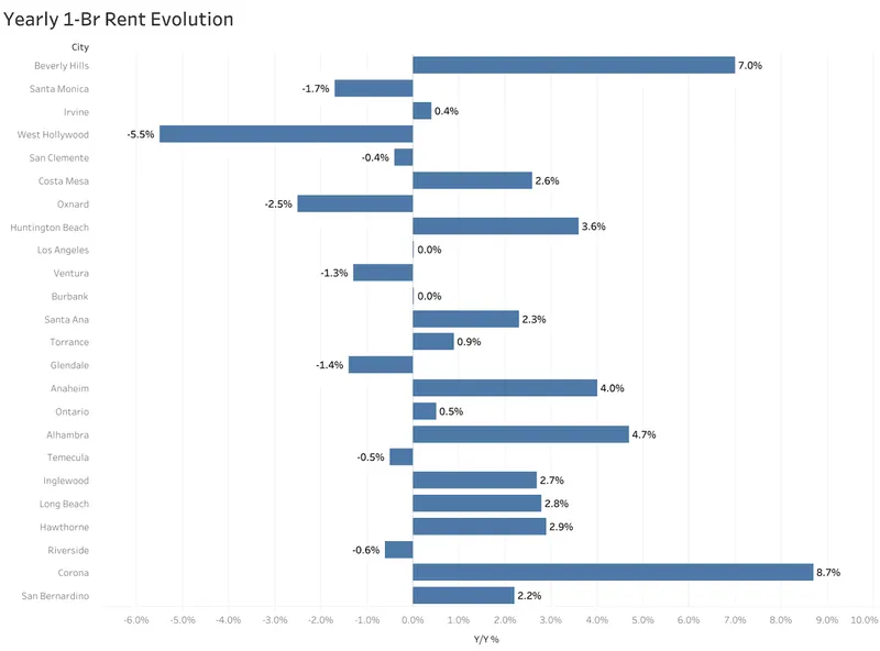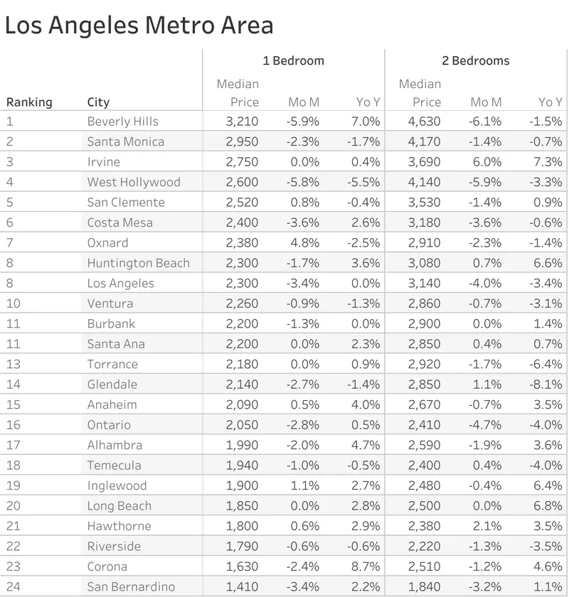 Corona registered the fastest year-over-year rent growth at 8.7%, followed by Beverly Hills at 7% and Alhambra at 4.7%. On a month-over-month basis, Oxnard saw the most significant increase at 4.8%.