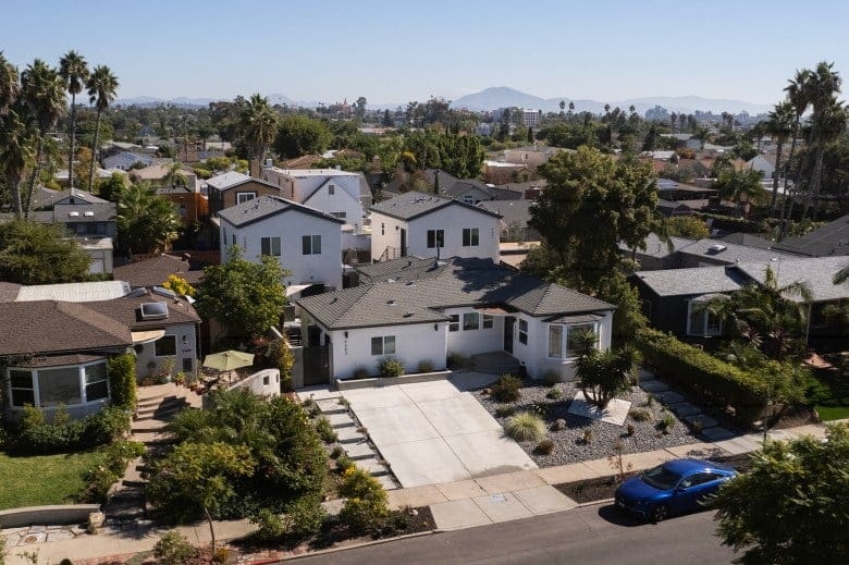 From the roundabout at Adams and 49th, in San Diego’s historic Talmadge neighborhood, the two ADU duplexes peek over the single-story house out front like a pair of peeping Toms. To Geoffrey Hueter, they’re about as welcome here.