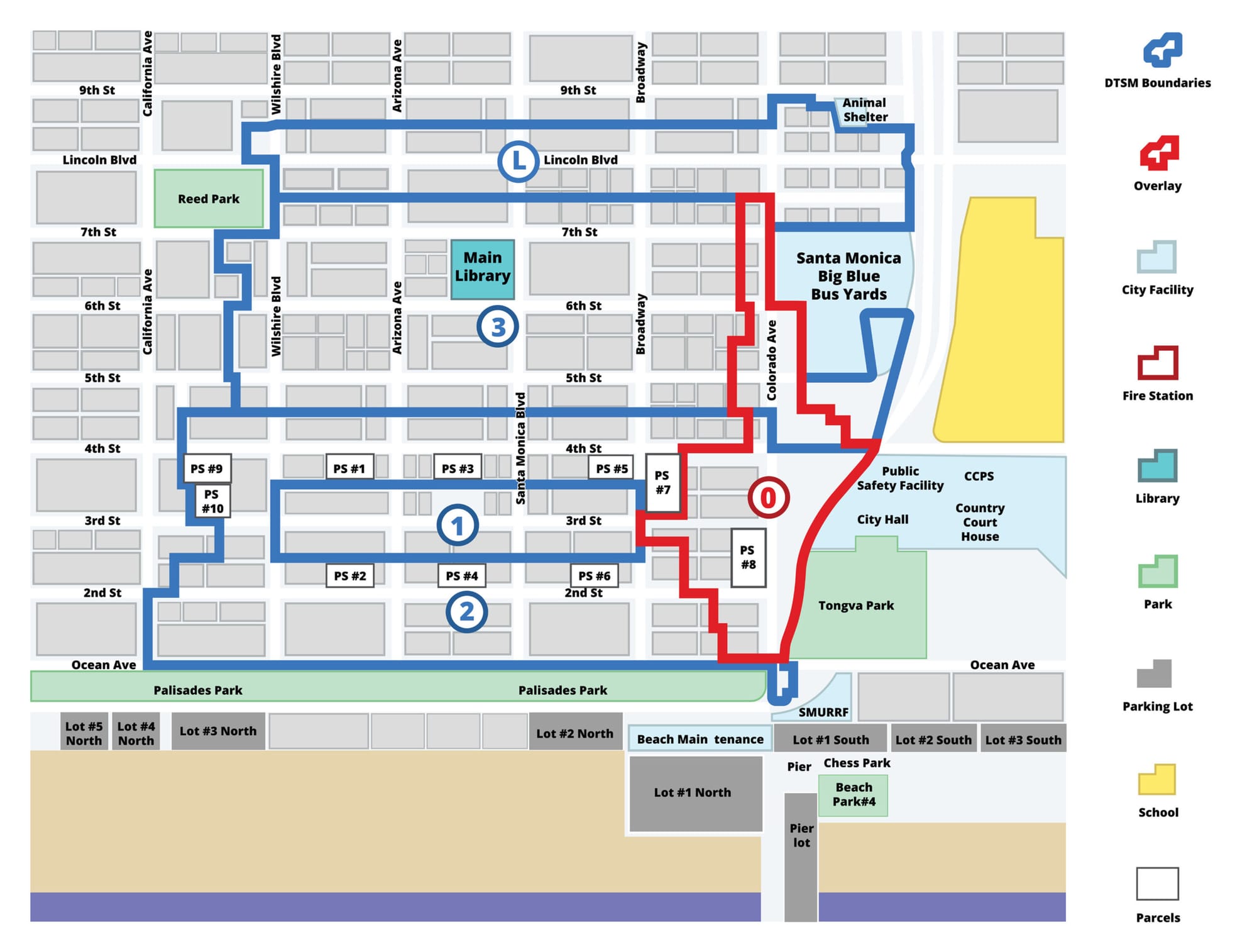 The areas that are set to be patrolled are the same that were set out originally. Coverage of the Downtown area will break down as follows: Zone 1 represents the three block length of the Third Street Promenade. Zone 2 surrounds Zone 1, providing a larger perimeter extending to 4th Ct, Ocean Ave, California Ave and Broadway. Zone 3 covers the area between 4th Ct and 7th Ct and approximately Wilshire Blvd to Colorado Ave. Zone L is from 7th Ct to 8th Ct and runs from Wilshire Blvd to Olympic Blvd. Finally, Zone 0 is a higgledy-piggledy shape incorporating the Santa Monica Place Mall, the Metro E-Line station and a little bit of Colorado Ave.