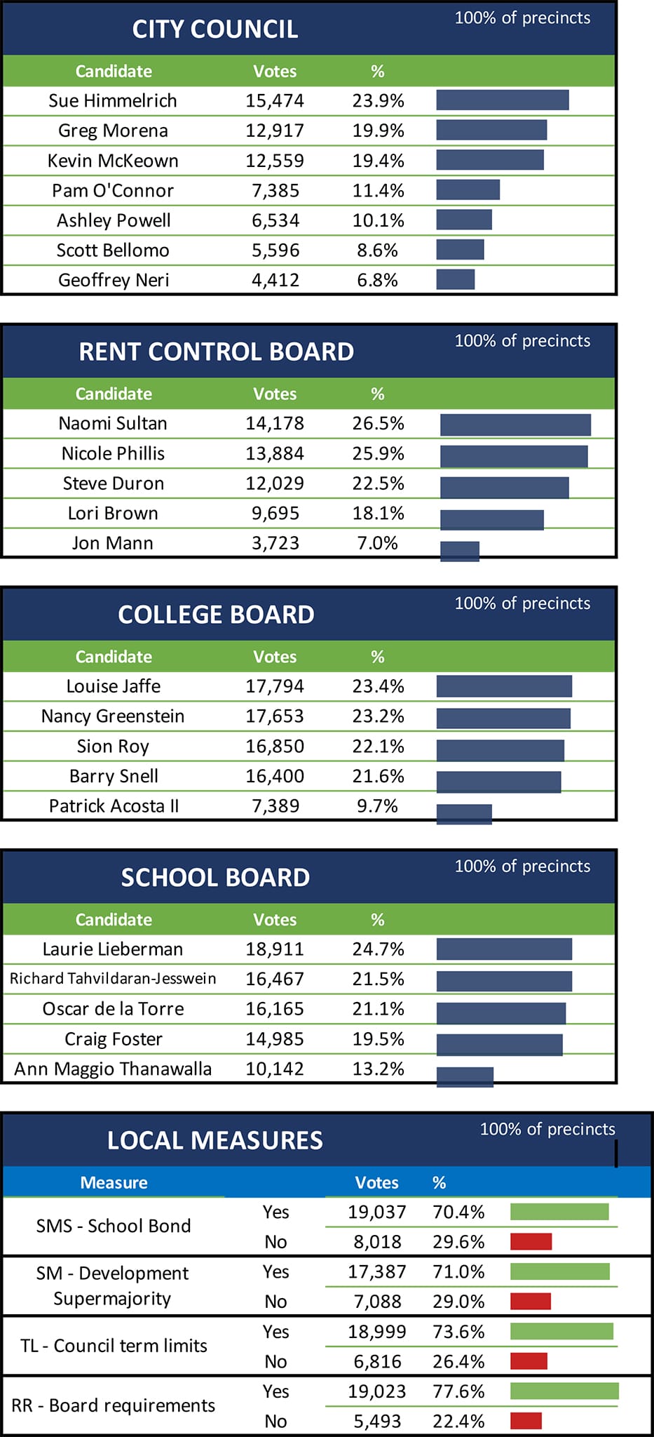 Laurie Lieberman had 18,911 votes (24.67%), Richard Tahvildaran-Jesswein had 16,467 votes (21.48%), Oscar de la Torre had 16,165 votes (21.08%) and Craig Foster had 14,985 votes (19.54%). Challenger Ann Maggio Thanawalla received 10,142 votes (13.23%).