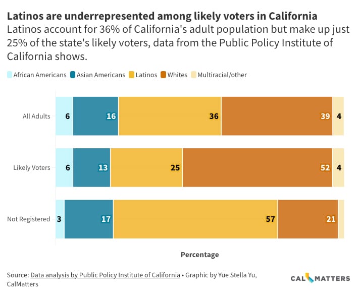 Lack of engagement is common among millions of eligible Latino Californians who miss out on voting each year. Latinos are the least likely to vote, though they comprise the single largest racial and ethnic group statewide, research shows. They account for just 25% of the state’s likely voters despite making up 36% of the adult population statewide, according to the Public Policy Institute of California.