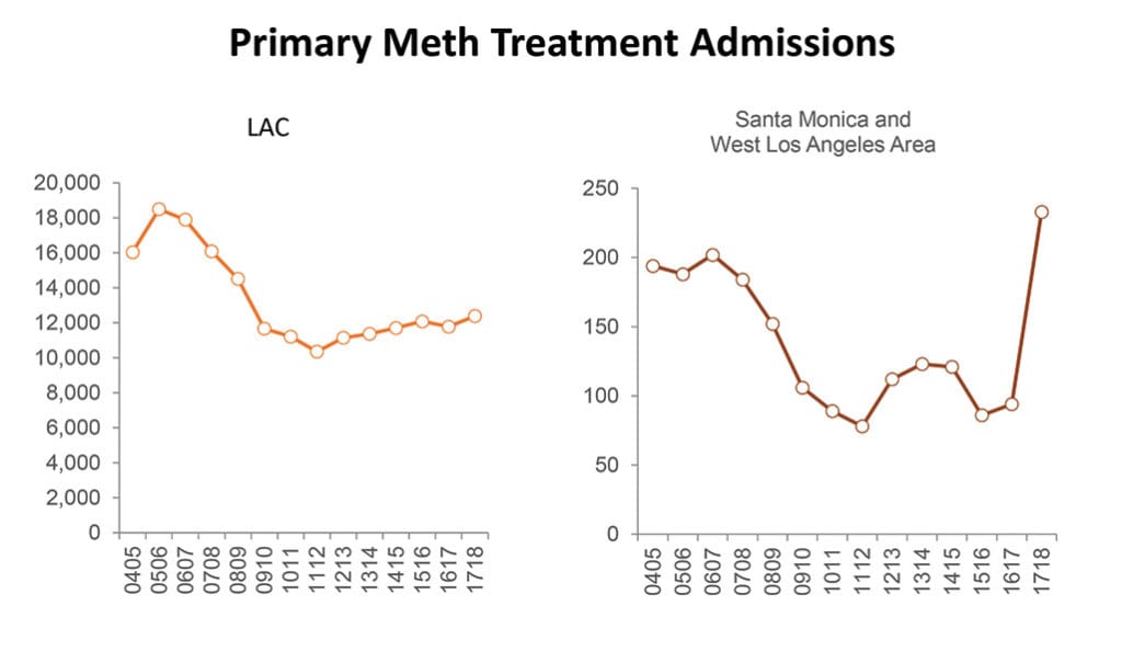 The Public Health data provides side by side comparisons for Los Angeles County as a whole and for Zip codes within four miles of Santa Monica. While the trends are similar, the Santa Monica area saw a dramatic increase in individuals seeking treatment for methamphetamine addiction in the last two years while the County figures remained relatively stable.